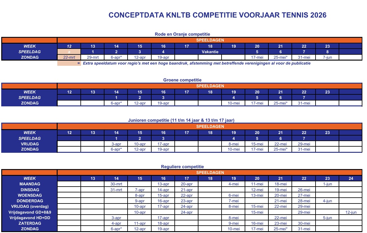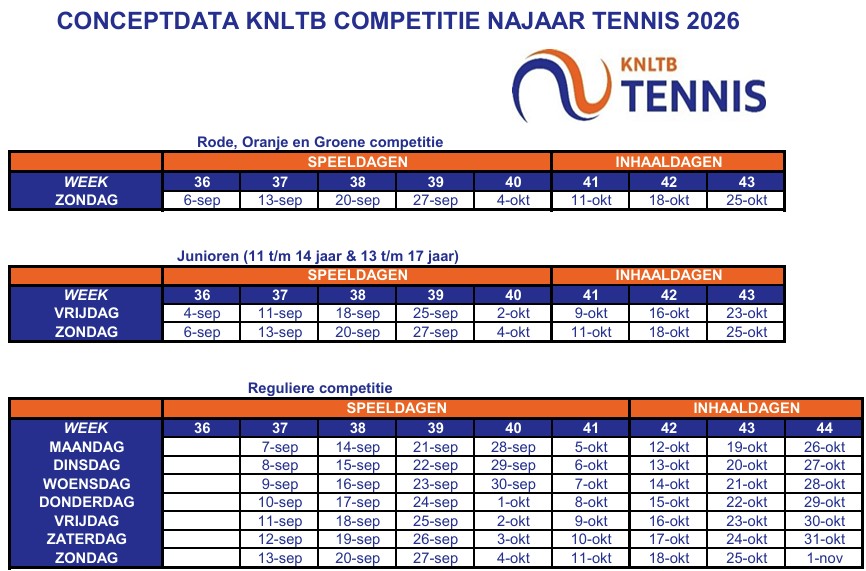 Voor de voorjaarscompetitie en najaarscompeitie 2026 zijn de concept speeldata al bekend.
